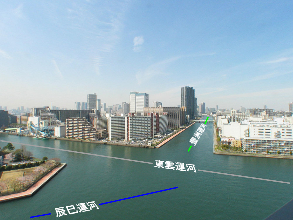 この画像を撮影するパノラマライブカメラは東京都江東区内、豊洲、東雲、辰巳運河の交差点に面しています。